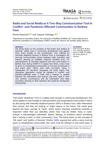 "The article draws on the concepts of “felt needs” and “politics of listening” widely used in community development and applies them more broadly to the humanitarian crisis suffered by internally displaced persons in Burkina Faso. It investigates the two-way communication stream between radio journalists and listeners drawing on feedback collected remotely from 153 representatives of internally displaced and host communities in Burkina Faso during COVID-19. It argues that while a voice must be given to marginalised communities, it must also be listened to and acted upon. Rather than radio journalism being a loudspeaker for top-down messaging, the study argues that alternative approaches should be adopted in conflict- and pandemic-affected areas. It finds that a balance is needed between the information that listeners feel they need in their new extreme circumstances and the information that radio journalists, drawing on their expertise, feel would be strategically empowering." (Abstract)