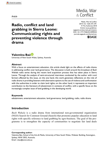 "With a focus on entertainment education, this article sheds light on the effects of radio drama in addressing conflict over land governance. The discussion is built around the broadcast of Bush Wahala radio series during the recent land acquisition process that has taken place in Sierra Leone. Through the analysis of semi-structured interviews conducted by the author with rural farmers affected by this issue, on the one hand, this work generates reflections on the role of radio drama in providing listeners with alternative options to the use of violence and confrontation with the authorities in order to claim land rights; on the other hand, it represents an important contribution to the literature of edutainment in contexts of conflict, with a specific focus on the increasingly complex issue of land grabbing in the developing world." (Abstract)