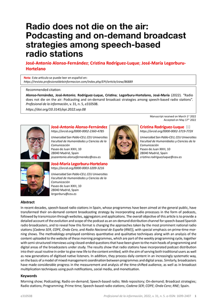 "In recent decades, speech-based radio stations in Spain, whose programmes have been aimed at the general public, have transformed their on-demand content broadcasting strategy by incorporating audio processes in the form of podcasts, followed by transmission through websites, aggregators and applications. The overall objective of this article is to provide a detailed account of the evolution and scope of the podcast as an on-demand distribution channel for speech-based Spanish radio broadcasters, and to reveal how this format is changing the approaches taken by the most prominent national radio stations [Cadena SER, COPE, Onda Cero, and Radio Nacional de España (RNE)], with special emphasis on prime-time morning shows. The methodology employed combines quantitative and qualitative techniques along with an analysis of the content uploaded to the website of these morning programmes, which are part of the weekly programming cycle, together with semi-structured interviews using closed-ended questions that have been given to the main heads of programming and digital areas of the broadcasters under study. The results show that radio stations have incorporated podcast distribution into their usual routine in order to give new life to the content emitted, with the aim of serving both traditional users as well as new generations of digitised native listeners. In addition, they process daily content in an increasingly systematic way, on the basis of a model of mixed management coordination between programmes and digital areas. Similarly, broadcasters have made considerable progress in the measurement and analysis of the time-shifted audience, as well as in broadcast multiplication techniques using push notifications, social media, and monetisation." (Abstract)