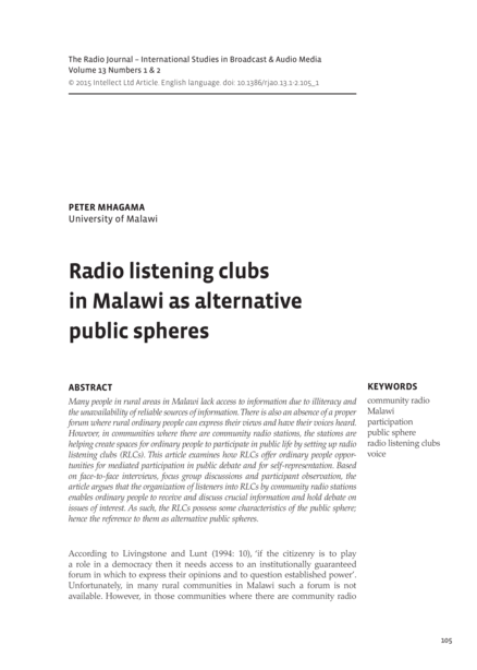 "Many people in rural areas in Malawi lack access to information due to illiteracy and the unavailability of reliable sources of information. There is also an absence of a proper forum where rural ordinary people can express their views and have their voices heard. However, in communities where there are community radio stations, the stations are helping create spaces for ordinary people to participate in public life by setting up radio listening clubs (RLCs). This article examines how RLCs offer ordinary people opportunities for mediated participation in public debate and for self-representation. Based on face-to-face interviews, focus group discussions and participant observation, the article argues that the organization of listeners into RLCs by community radio stations enables ordinary people to receive and discuss crucial information and hold debate on issues of interest. As such, the RLCs possess some characteristics of the public sphere; hence the reference to them as alternative public spheres." (Abstract)