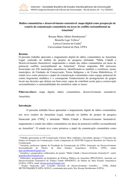 "O presente trabalho apresenta o mapeamento digital de rádios comunitárias na Amazônia Legal, realizado no âmbito do projeto de pesquisa intitulado “Mídia Cidadã e Desenvolvimento Sustentável: mapeamento e estudo das rádios comunitárias em áreas de potencial conflito socioambiental na Amazônia”. Foram mapeadas 498 emissoras licenciadas em 436 municípios amazônicos, identificando-se também a existência, nestes municípios, de Unidades de Conservação, Terras Indígenas e de Usinas Hidrelétricas. O estudo teve como premissa o papel da comunicação comunitária como espaço potencial de contra hegemonia midiática e o consequente fortalecimento do protagonismo de grupos locais nas decisões que afetem seu bem-estar, capaz de contribuir assim para a conservação socioambiental e a sustentabilidade dos territórios onde se insere." (Resumo)