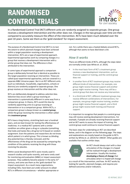 "In a Randomised Control Trial (RCT) different units are randomly assigned to separate groups. One group receives a development intervention and the other does not. Changes in the two groups over time are then compared to accurately measure the effect of the intervention. RCTs have been much debated over the past 10 years. Some see them as the ‘gold standard’ for impact assessment." (Introduction)