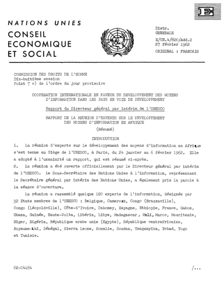"La réunion d'experts sur le développement des moyens d'information en Afrique s'est tenue au Siège de l'UNESCO, a Paris, du 24 janvier au 6 février 1962. Elle a adoptá a l'unanimité un rapport, qui est résumé ci-après. La réunion a été ouverte officiellement par le Directeur général par intérim de l'UNESCO. Le Sous-Secrétaire des Nations Unies à l'information,, représentant le Secrétaire général par intérim des Nations Unies, a également pris la parole à la seánce d'ouverture. La réunion a rassemblé quelque 120 experts de l'information, désignés par 32 Etats membres de l'UNESCO [...]" (Page 1)