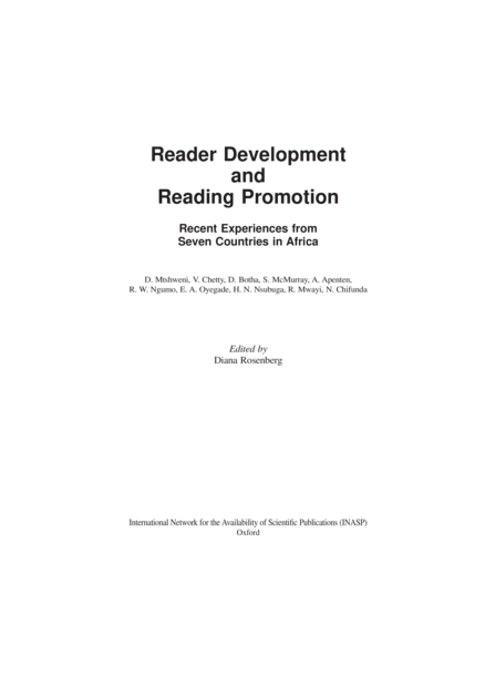 "The result of a workshop held during the Standing Conference of Eastern, Central and Southern Africa Librarians (SCESAL) held in Johannesburg in April 2002, this volume reviews current reader development activities by public libraries in different regions of Africa. It includes accounts and case studies by contributors from Ghana, Kenya, Nigeria, South Africa, Tanzania, Uganda and Zambia, covering predominantly work with children, but with three papers devoted to adult reader development. An introduction provides a summary of the papers, and reviews factors such as availability and accessibility of relevant books, the importance of building partnerships with other interested sectors, aspects of training, monitoring and evaluation, and the need for the establishment of reader development policies." (Hans M. Zell, Publishing, Books & Reading in Sub-Saharan Africa, 3d ed. 2008, nr. 2213)