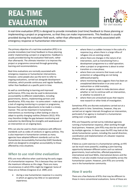 "A real-time evaluation (RTE) is designed to provide immediate (real time) feedback to those planning or implementing a project or programme, so that they can make improvements. This feedback is usually provided during the evaluation field work, rather than afterwards. RTEs are normally associated with emergency response or humanitarian interventions." (Introduction)