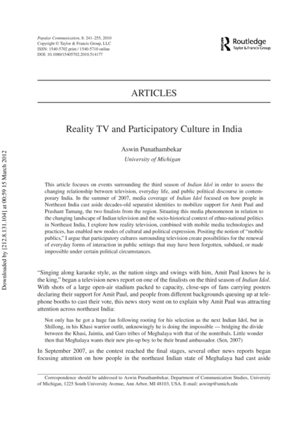 "This article focuses on events surrounding the third season of 'Indian Idol' in order to assess the changing relationship between television, everyday life, and public political discourse in contemporary India. In the summer of 2007, media coverage of Indian Idol focused on how people in Northeast India cast aside decades-old separatist identities to mobilize support for Amit Paul and Prashant Tamang, the two finalists from the region. Situating this media phenomenon in relation to the changing landscape of Indian television and the socio-historical context of ethno-national politics in Northeast India, I explore how reality television, combined with mobile media technologies and practices, has enabled new modes of cultural and political expression. Positing the notion of “mobile publics,” I argue that participatory cultures surrounding television create possibilities for the renewal of everyday forms of interaction in public settings that may have been forgotten, subdued, or made impossible under certain political circumstances." (Abstract)