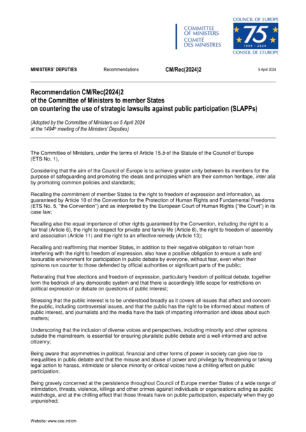 Recommendation CM/Rec(2024)2 of the Committee of Ministers to member States on countering the use of strategic lawsuits against public participation (SLAPPs)