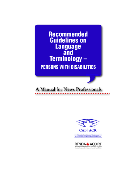 "This manual presents a series of recommended guidelines for broadcasters for the use of language and terminology when referencing persons with disabilities in broadcast news. It has been developed on the basis of previous research conducted on behalf of Canada’s private broadcasters by the Canadian Association of Broadcasters and in consultation with the Canadian disability community and Canadian news broadcasters. This manual is not intended for use as an industry code, nor as a set of binding rules for broadcasters. Rather, it has been designed to familiarize broadcast news professionals with the terminology that is preferred by the Canadian disability community. It is not intended for use with other programming categories such as comedy or drama." (Introduction, page 2)