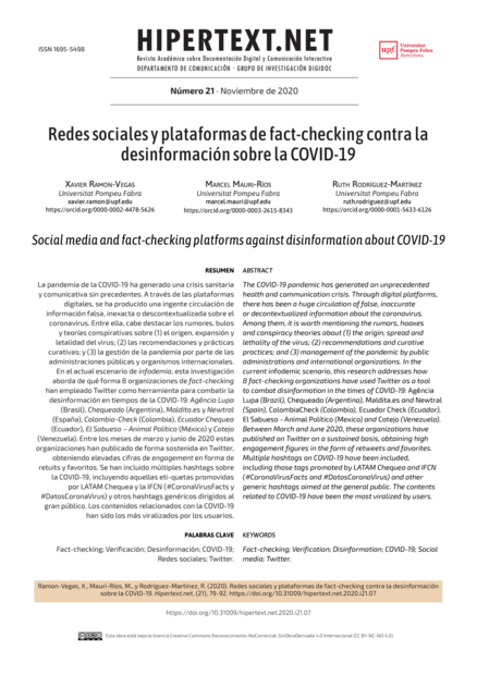"La pandemia de la COVID-19 ha generado una crisis sanitaria y comunicativa sin precedentes. A través de las plataformas digitales, se ha producido una ingente circulación de información falsa, inexacta o descontextualizada so-bre el coronavirus. Entre ella, cabe destacar los rumores, bulos y teorías conspirativas sobre (1) el origen, expansión y letalidad del virus; (2) las re-comendaciones y prácticas curativas; y (3) la gestión de la pandemia por parte de las administraciones públicas y organismos internacionales. En el actual escenario de infodemia, esta investigación aborda de qué forma 8 organizaciones de fact-checking han empleado Twitter como herramienta para combatir la desinformación en tiempos de la COVID-19: Agência Lupa (Brasil), Chequeado (Argentina), Maldita.es y Newtral (España), Colombia-Check (Colombia), Ecuador Chequea (Ecuador), El Sabueso – Animal Político (México) y Cotejo (Venezuela). Entre los meses de marzo y junio de 2020 estas organizaciones han publicado de forma sostenida en Twitter, obteniendo elevadas cifras de engagement en forma de retuits y favoritos. Se han incluido múltiples hashtags sobre la COVID-19, incluyendo aquellas etiquetas promovidas por LATAM Chequea y la IFCN (#CoronaVirusFacts y #DatosCoronaVirus) y otros hashtags genéricos dirigidos al gran público. Los contenidos relacionados con la COVID-19 han sido los más viralizados por los usuarios." (Resumen)