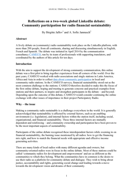 "A lively debate on (community) radio sustainability took place on the LinkedIn platform, with more than 200 people, from all continents, sharing and discussing simultaneously in English, French and Spanish. The debate was initiated in April 2014 by the communication consultancy CAMECO, run by its team of professionals with supporting translators, and coordinated by the authors of this article for ten days." (Abstract)
