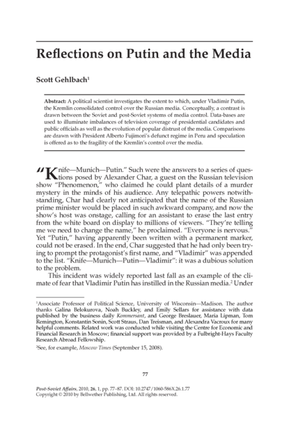 "To understand the potential implications of Putin’s media strategy, it is useful to recall the rule and fall of Peru’s Alberto Fujimori. Like Putin, Fujimori used the wealth and power at his disposal to emasculate much of the country’s media. Also like Putin, however, he stopped short of imposing a uniform system of state ownership and censorship [...] In principle, the “minimalist” system of media control used by authoritarian leaders like Putin and Fujimori can work indefinitely, but it is vulnerable to shocks. Control of only the commanding heights leaves room for information to circulate at lower altitudes, threatening the regime’s carefully calibrated message." (Page 85)