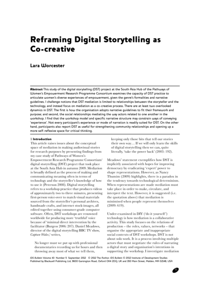 "This study of the digital storytelling (DST) project at the South Asia Hub of the Pathways of Women’s Empowerment Research Programme Consortium examines the capacity of DST practice to articulate women’s diverse experiences of empowerment, given the genre’s formalities and narrative guidelines. I challenge notions that DST mediation is limited to relationships between the storyteller and the technology, and instead focus on mediation as a co-creative process. There are at least two overlooked dynamics in DST. The first is how the organisation adopts narrative guidelines to fit their framework and purpose; and second, the social relationships mediating the way actors related to one another in the workshop. I find that the workshop model and specific narrative structure may constrain ways of conveying ‘experience’. Not every participant’s experience or mode of narration is readily suited for DST. On the other hand, participants also report DST as useful for strengthening community relationships and opening up a more self-reflexive space for critical thinking." (Abstract)
