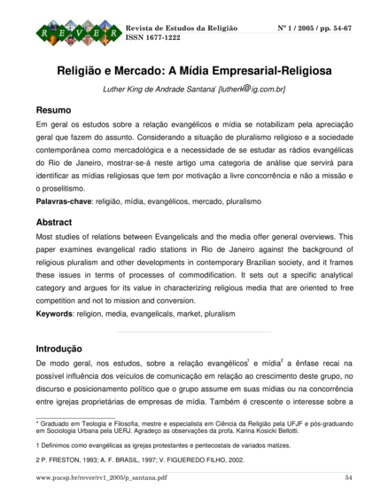 "Em geral os estudos sobre a relação evangélicos e mídia se notabilizam pela apreciação geral que fazem do assunto. Considerando a situação de pluralismo religioso e a sociedade contemporânea como mercadológica e a necessidade de se estudar as rádios evangélicas do Rio de Janeiro, mostrar-se-á neste artigo uma categoria de análise que servirá para identificar as mídias religiosas que tem por motivação a livre concorrência e não a missão e o proselitismo." (Resumo)