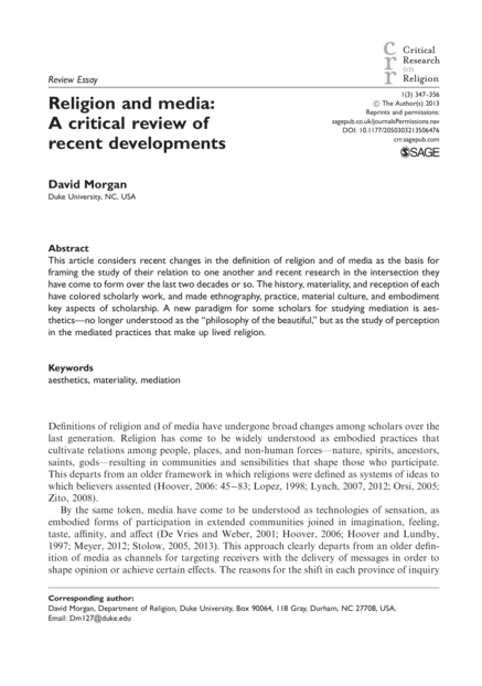 "This article considers recent changes in the definition of religion and of media as the basis for framing the study of their relation to one another and recent research in the intersection they have come to form over the last two decades or so. The history, materiality, and reception of each have colored scholarly work, and made ethnography, practice, material culture, and embodiment key aspects of scholarship. A new paradigm for some scholars for studying mediation is aesthetics—no longer understood as the ‘‘philosophy of the beautiful,’’ but as the study of perception in the mediated practices that make up lived religion." (Abstract)