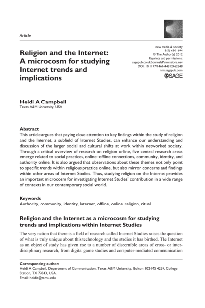 "Through a critical overview of research on religion online, five central research areas emerge related to social practices, online-offline connections, community, identity, and authority online. It is also argued that observations about these themes not only point to specific trends within religious practice online, but also mirror concerns and findings within other areas of Internet Studies. Thus, studying religion on the Internet provides an important microcosm for investigating Internet Studies' contribution in a wide range of contexts in our contemporary social world." (Abstract)