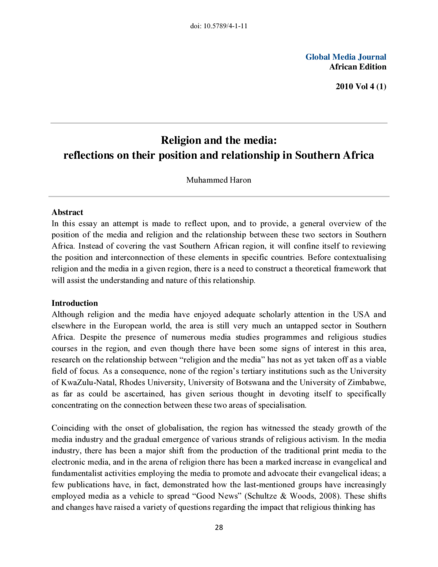 "In this essay an attempt is made to reflect upon, and to provide, a general overview of the position of the media and religion and the relationship between these two sectors in Southern Africa. Instead of covering the vast Southern African region, it will confine itself to reviewing the position and interconnection of these elements in specific countries. Before contextualising religion and the media in a given region, there is a need to construct a theoretical framework that will assist the understanding and nature of this relationship." (Abstract)