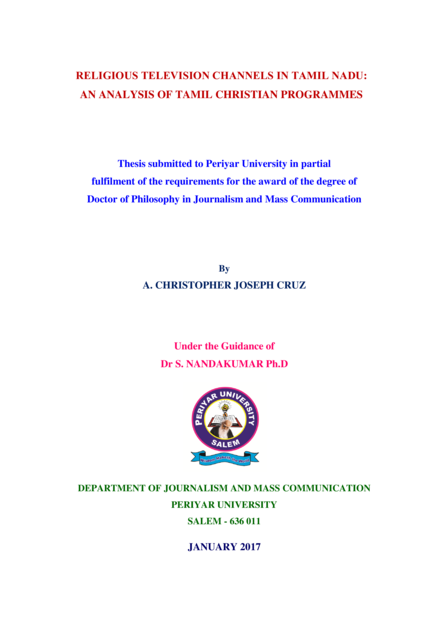 "In a nutshell, this research reveals that indigenous Tamil Christian satellite television channels [i.e., Angel TV, Aaseervatham TV, Madha TV, Power of God TV, Salvation TV] are liked by the Christian viewers. The viewers watch those channels for the gratifications of moral, psychological, and religious benefits. Therefore, the religious television channels have multiple responsibilities of gratifying the viewers morally, socially, culturally, and psychologically. This research makes a gentle recommendation to the Christians in Tamil Nadu that they may watch Tamil Christian religious channels to fulfil their religious, moral, psychological, social, cultural, educational, and family needs." (Page 238)