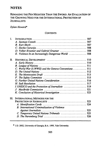 "It is the goal of this note to explore this problem with a particular emphasis on potential methods by which the international community can work to protect the press. In order to better understand this problem as it exists today, this note begins with a historical analysis of the development of international efforts to remedy and prevent it. This analysis is not meant to be comprehensive, but merely to provide some insight into the historical development of this problem on the international stage. In the interest of continuity, this historical analysis is organized with an overall topical structure as opposed to a strictly chronological one. This note then addresses a variety of methods by which the international community could take action to protect journalists in the future. It is ultimately the goal of this note to generate workable suggestions for a future regime, both preventative and punitive. Although it remains unclear what can be done in the aftermath of one of the single most lethal years for journalists in the history of the profession, it is deadly clear that something must be done." (Abstract)