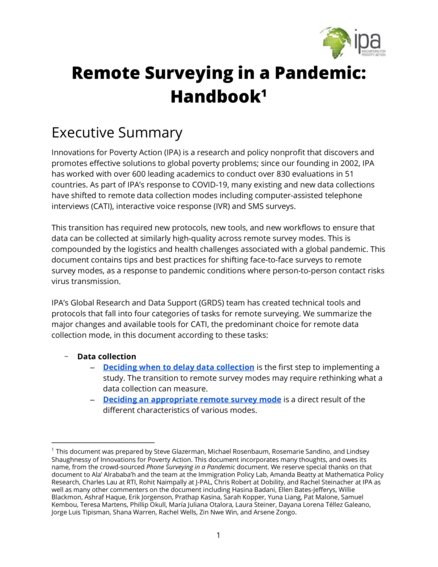 "As part of IPA’s response to COVID-19, many existing and new data collections have shifted to remote data collection modes including computer-assisted telephone interviews (CATI), interactive voice response (IVR) and SMS surveys. This transition has required new protocols, new tools, and new workflows to ensure that data can be collected at similarly high-quality across remote survey modes. This is compounded by the logistics and health challenges associated with a global pandemic. This document contains tips and best practices for shifting face-to-face surveys to remote survey modes, as a response to pandemic conditions where person-to-person contact risks virus transmission. IPA’s Global Research and Data Support (GRDS) team has created technical tools and protocols that fall into four categories of tasks for remote surveying. We summarize the major changes and available tools for CATI, the predominant choice for remote data collection mode." (Executive summary, page 1)