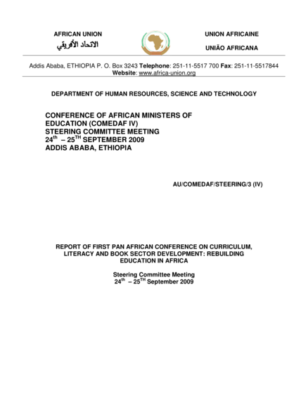"Within the framework of the Second Decade for Africa 2006-2015, the First Pan African Conference on Curriculum, Literacy and Book Sector Development: Rebuilding Education in Africa, was held in Dar es Salaam, Tanzania from the 24th to 27th March 2009. The objectives of the conference were to critically analyze the status of curricula, literacy and the book sector, and propose a continental book policy framework, with guidelines for developing national and regional policies; as well as making recommendations to ensure that an African-centred curriculum will enhance African languages and revitalize the educational book sector." (Hans M. Zell, Publishing, Books & Reading in Sub-Saharan Africa, 3d ed. 2008, nr. 2555)