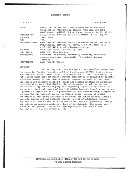 Report of the Regional Consultation for Asia-Pacific Co-Operative Programme in Reading Promotion and Book Development (APPREB): Tokyo 20-21 November 1997