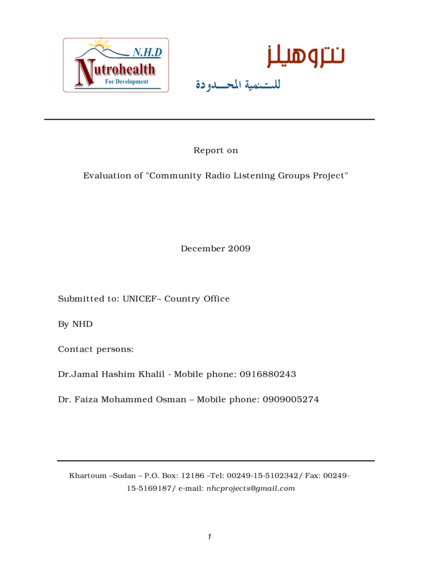 "In 2002 the UNICEF in collaboration with the Ministry of Information and Communication ( represented by Sudan Radio & TV Corporation –SRTC) launched a pilot project of Community Radio Listening Groups (CRLGs), designed to reach population in hard to reach areas in the country with messages and development information. Gradually the project expanded to cover more sites in northern states of Sudan. This Evaluation was commissioned to assess the extent to which the project delivered promised benefits and involved local participation; and to test the social impacts on the local communities where the project operated." (Page 4)