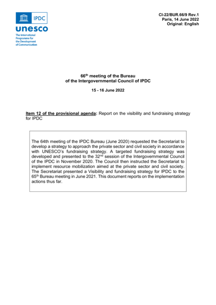 "The 64th meeting of the IPDC Bureau (June 2020) requested the Secretariat to develop a strategy to approach the private sector and civil society in accordance with UNESCO’s fundraising strategy. A targeted fundraising strategy was developed and presented to the 32nd session of the Intergovernmental Council of the IPDC in November 2020. The Council then instructed the Secretariat to implement resource mobilization aimed at the private sector and civil society. The Secretariat presented a Visibility and fundraising strategy for IPDC to the 65th Bureau meeting in June 2021. This document reports on the implementation actions thus far." (Page 1)