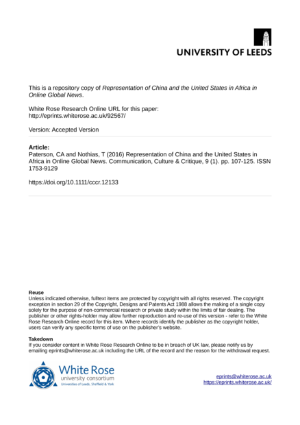"This article examines global representation of the primary continental imperialisms reshaping contemporary Africa: the parallel expansionist exercises of China (centering on commercial expansion) and of the United States (centering on military expansion). Our analysis assesses the current state of these continent-wide involvements and sets out the background of how US-African and Sino-African relationships have been portrayed by news media. We then analyze how both Chinese and US expansions in Africa are represented by three prominent global media organizations online: Al Jazeera English, BBC and CNN. This research concludes that global media report modern imperialism in Africa mostly in ways that support the imperial project rather than mobilize resistance toward it." (Abstract)