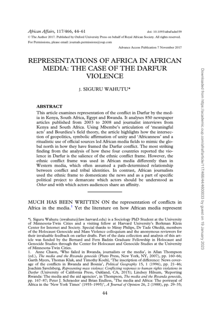 "This article examines representation of the conflict in Darfur by the media in Kenya, South Africa, Egypt and Rwanda. It analyses 850 newspaper articles published from 2003 to 2008 and journalist interviews from Kenya and South Africa. Using Mbembe’s articulation of ‘meaningful acts’ and Bourdieu’s field theory, the article highlights how the intersection of geopolitics, symbolic affirmation of unity and ‘Africanness’ and a ritualistic use of official sources led African media fields to mimic the global north in how they have framed the Darfur conflict. The most striking finding from the analysis of how these four countries reported the violence in Darfur is the salience of the ethnic conflict frame. However, the ethnic conflict frame was used in African media differently than in Western media, which often assumed a path-determined relationship between conflict and tribal identities. In contrast, African journalists used the ethnic frame to domesticate the news and as a part of specific political project to demarcate which actors should be understood as Other and with which actors audiences share an affinity." (Abstract)