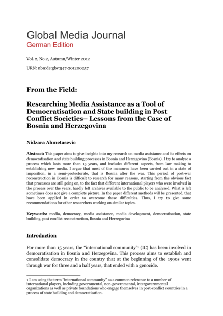 "This paper aims to give insights into my research on media assistance and its effects on democratisation and state building processes in Bosnia and Herzegovina (Bosnia). I try to analyse a process which lasts more than 15 years, and includes different aspects, from law making to establishing new media. I argue that most of the measures have been carried out in a state of imposition, in a semi-protectorate, that is Bosnia after the war. This period of post-war reconstruction in Bosnia is difficult to research for many reasons, starting from the obvious fact that processes are still going on, to the fact that different international players who were involved in the process over the years, hardly left archives available to the public to be analysed. What is left sometimes does not give a complete picture. In the paper different methods will be presented, that have been applied in order to overcome these difficulties. Thus, I try to give some recommendations for other researchers working on similar topics." (Abstract)