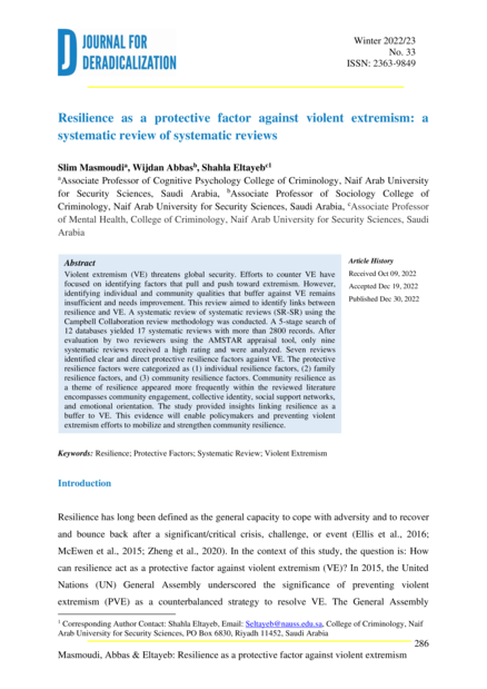 "Violent extremism (VE) threatens global security. Efforts to counter VE have focused on identifying factors that pull and push toward extremism. However, identifying individual and community qualities that buffer against VE remains insufficient and needs improvement. This review aimed to identify links between resilience and VE. A systematic review of systematic reviews (SR-SR) using the Campbell Collaboration review methodology was conducted. A 5-stage search of 12 databases yielded 17 systematic reviews with more than 2800 records. After evaluation by two reviewers using the AMSTAR appraisal tool, only nine systematic reviews received a high rating and were analyzed. Seven reviews identified clear and direct protective resilience factors against VE. The protective resilience factors were categorized as (1) individual resilience factors, (2) family resilience factors, and (3) community resilience factors. Community resilience as a theme of resilience appeared more frequently within the reviewed literature encompasses community engagement, collective identity, social support networks, and emotional orientation. The study provided insights linking resilience as a buffer to VE. This evidence will enable policymakers and preventing violent extremism efforts to mobilize and strengthen community resilience." (Abstract)