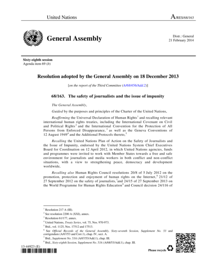 Resolution Adopted by the General Assembly on 18 December 2013: 68/163. The Safety of Journalists and the Issue of Impunity