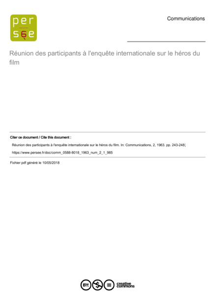 "Réunion organisée dans le cadre du film d'Amérique Latine sous les auspices du Columbianum (Gênes) et avec l'appui de l'Association Internationale de Sociologie et de l'UNESCO qui patronnent l'enquête. L'enquête a pour objet l'étude comparée de la présentation des héros de film dans les diverses productions nationales — Le but de l'enquête est surtout d'étudier l'importance du héros de film dans la civilisation contemporaine — Le Tiers-Monde est représenté par l'Inde uniquement — Extraits des rapports d'équipe." (Jean-Marie Van Bol, Abdelfattah Fakhfakh: The use of mass media in the developing countries. Brussels: CIDESA, 1971 Nr. 1970, topic code 39)