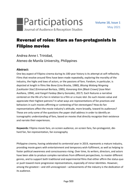 "One key aspect of Filipino cinema during its 100-year history is its attempt at self-reflexivity. Films that revolve around films have been made repeatedly, exploring the morality of the industry, the highs and lows of actors, or the passions of fans. Fandom, in particular, is depicted at length in films like Bona (Lino Brocka, 1980), Bituing Walang Ningning [Lackluster Star] (Emmanuel Borlaza, 1985), Konorang Itim [Black Crown] (Jose Mari Avellana, 1994), and Fangirl Fanboy (Barry Gonzalez, 2017). Each features a narrative centered on the life of a fan in relation to a film or a music idol. Do such movies value and appreciate their highest patrons? In what ways are representations of fan practices and behaviors in such movies affirming or contesting of fan stereotypes? How do fan representations affect the movie industry’s attitude, more broadly, toward its audiences? These are only some of the questions the paper shall address in order to identify an iconographic understanding of fans, based on movies that directly recognize their existence and narrate their experiences." (Absract)