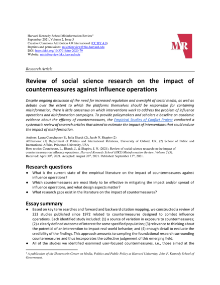 "Based on key term searches and forward and backward citation mapping, we constructed a review of 223 studies published since 1972 related to countermeasures designed to combat influence operations. Each identified study included: (1) a source of variation in exposure to countermeasures; (2) a clearly defined outcome of interest for some specified population; (3) relevance to thinking about the potential of an intervention to impact real-world behavior; and (4) enough detail to evaluate the credibility of the findings. This approach amounts to sampling the foundational research surrounding countermeasures and thus incorporates the collective judgement of this emerging field. All of the studies we identified examined user-focused countermeasures, i.e., those aimed at the consumers of disinformation. None looked at countermeasures aimed at impacting the influence operations directly. There exists a mismatch between the major interventions taken by platforms - algorithmic downranking, content moderation, redirection, and deplatforming accounts - and those studied by the research community. Most papers we reviewed focus on one particular method for countering information operations: fact-checking and its many offshoots. The types of interventions employed by social media companies on actual users are understudied. We recommend further research on four key areas: (1) measuring the impact of the most common interventions by social media platforms, (2) assessing the impact of countermeasures on real-world behaviors (both online and offline), (3) evaluating the efficacy of countermeasures in non-Western contexts, and (4) studying countermeasures that target the creators of disinformation content in addition to studying consumer-facing policies." (Essay summary)