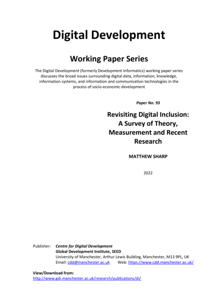 "Focusing on the internet as a foundational technology, this paper begins by summarising recent developments in digital inclusion theory, particularly as this relates to developing countries. It sets out a framework of core components of digital inclusion - including access/use, quality of access/use, affordability, and digital skills - and briefly considers policy implications. The paper then surveys the ways these components are currently measured in household and firm surveys and by international organisations, highlighting some of the often-overlooked weaknesses of current measures, and suggesting possible improvements. The paper also reflects on potential applications of (and risks associated with) new ways of measuring digital inclusion using big data. Lastly, building on the framework developed, the paper reviews the empirical literature on ‘digital divides’ in developing countries, and makes suggestions for how future research could become more rigorous and useful." (Abstract)