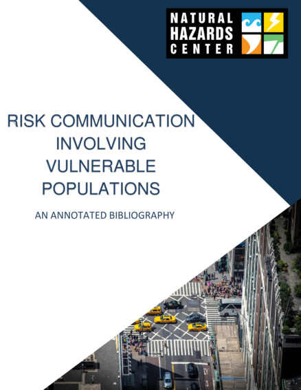"This document is intended to be used as a resource bibliography for in-depth reading about risk communication best practices. It summarizes academic research and practical guidance on the topic of hazards and disaster risk communication, with a particular focus on socially vulnerable populations. It is organized around three primary sections, including: 1) General Risk Communication Guidance; 2) Risk Communication and Social Vulnerability; 3) Risk Communication Across the Disaster Lifecycle. This bibliography identifies widely accepted risk communication principles that apply across the disaster lifecycle; however, the focus on social vulnerability sets it apart from other published resources on the topic of risk communication. It highlights materials that demonstrate how risk communication insights apply to a diverse array of socially vulnerable groups—defined here as those who face disproportionate disaster risk due to a variety of historical, social, economic, and political conditions." (Overview)