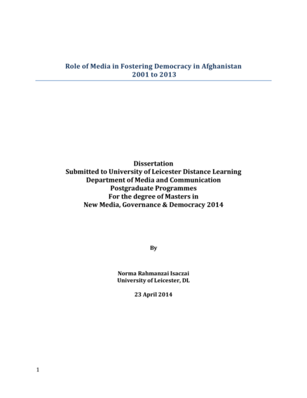 "This dissertation is a study about the growth and development of media in Afghanistan and its role and contribution to national and international collective efforts to build a modern, stable and democratic Afghanistan in the last decade. In pursuing my dissertation, I have examined the Afghan media landscape by focusing on the regulatory environment, the type and breadth of broadcast and print media, the role of donors and foreign aid and the extent to which media has a played a role in fostering democracy in the country. The dissertation concludes with analyzing the future of Afghan media and freedom of expression following the departure of foreign forces and international community at the end of 2014 and their impact on sustainability of media in light of support they have received from the outside world. The dissertation concludes that, while there are challenges ahead, Afghan media has benefited from a decade of foreign assistance, has contributed to fostering democracy in Afghanistan and can stand on its own with the decline of foreign aid to Afghanistan in the future." (Abstract)