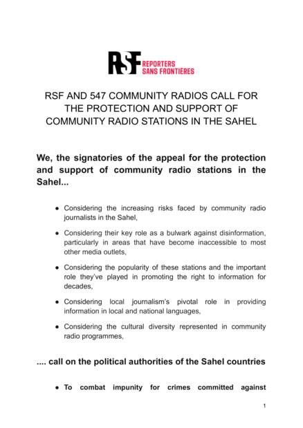 "We, the signatories of the appeal for the protection and support of community radio stations in the Sahel [...] call on the political authorities of the Sahel countries to combat impunity for crimes committed against community radio journalists by systematically opening investigations to ensure that these murders do not go unpunished; to break the silence on the fate and whereabouts of community radio journalists kidnapped by armed gangs and take action to secure their release; to help rebuild community radio premises destroyed by attacks and to support them in restoring their professional equipment; to provide community radio teams with security training; to recognise the importance of community radio stations as key players in the right to information in the Sahel in media legislation." (Pages 1-2)