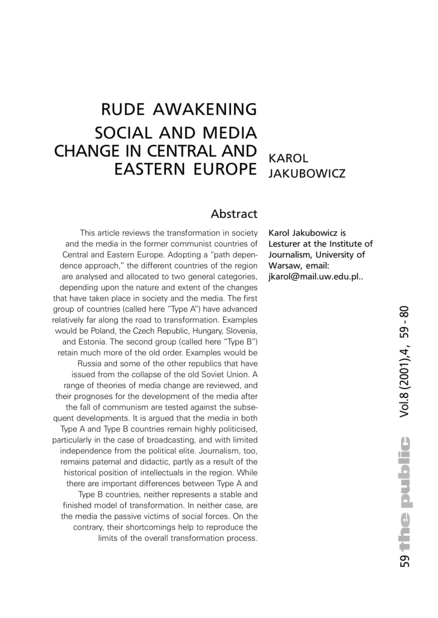"This article reviews the transformation in society and the media in the former communist countries of Central and Eastern Europe. Adopting a path dependence approach, "the different countries of the region are analysed and allocated to two general categories, depending upon the nature and extent of the changes that have taken place in society and the media. The first group of countries (called here .Type A.) have advanced relatively far along the road to transformation. Examples would be Poland, the Czech Republic, Hungary, Slovenia, and Estonia. The second group (called here .Type B.) retain much more of the old order. Examples would be Russia and some of the other republics that have issued from the collapse of the old Soviet Union. A range of theories of media change are reviewed, and their prognoses for the development of the media after the fall of communism are tested against the subsequent developments. It is argued that the media in both Type A and Type B countries remain highly politicised, particularly in the case of broadcasting, and with limited independence from the political elite. Journalism, too, remains paternal and didactic, partly as a result of the historical position of intellectuals in the region. While there are important differences between Type A and Type B countries, neither represents a stable and finished model of transformation. In neither case, are the media the passive victims of social forces. On the contrary, their shortcomings help to reproduce the limits of the overall transformation process." (Abstract)