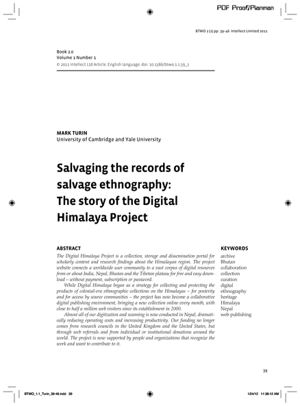 "The Digital Himalaya Project is a collection, storage and dissemination portal for scholarly content and research findings about the Himalayan region. The project website connects a worldwide user community to a vast corpus of digital resources from or about India, Nepal, Bhutan and the Tibetan plateau for free and easy download - without payment, subscription or password. While Digital Himalaya began as a strategy for collecting and protecting the products of colonial-era ethnographic collections on the Himalayas - for posterity and for access by source communities - the project has now become a collaborative digital publishing environment, bringing a new collection online every month, with close to half a million web visitors since its establishment in 2000. Almost all of our digitization and scanning is now conducted in Nepal, dramatically reducing operating costs and increasing productivity. Our funding no longer comes from research councils in the United Kingdom and the United States, but through web referrals and from individual or institutional donations around the world. The project is now supported by people and organizations that recognize the work and want to contribute to it. In short, what began as an academic research project a decade ago is now a vast online portal for hosting and disseminating knowledge about the HiMalayas to a demanding, fast-growing and truly global user base." (Abstract)