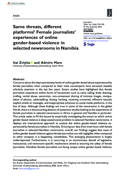 "Concerns about the disproportionate levels of online gender-based abuse experienced by female journalists when compared to their male counterparts have attracted sizeable scholarly attention in the last few years. Extant studies have highlighted that female journalists experience online forms of harassment such as name calling, body shaming, trolling, verbal abuse, sextortion, non-consensual sharing of intimate images, manipulation of photos, cyberstalking, doxing, hacking, receiving unwanted, offensive sexually explicit emails or messages, and inappropriate advances on social media platforms, in the line of duty. Although these findings are true in some of the newsrooms in the global North, there is a disconcerting absence of systematic studies looking at the experiences of female journalists in selected newsrooms in Africa in general and Namibia in particular. This article seeks to fill this lacuna by empirically investigating the extent to which online gender-based violence is deep-seated social problem in selected Namibian newsrooms. It deploys the intersectional approach to analyze the online gender-based violence experienced by female journalists in Namibia. Drawing our data from interviews with female journalists in selected Namibian newsrooms, overall, our findings suggest that cases of online gender-based violence against female journalists are still negligible when compared to other contexts, it is happening, nonetheless. This emerging phenomenon is largely underreported. Furthermore, it is occurring in an environment devoid of legislative, institutional, and newsroom-specific mechanisms aimed at ensuring the safety of female journalists. Namibian female journalists are facing unique online gender-based violence, which contributes immensely towards self-censorship and retreating from the public sphere." (Abstract)