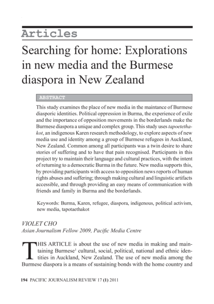 "This study examines the place of new media in the maintance of Burmese diasporic identities. Political oppression in Burma, the experience of exile and the importance of opposition movements in the borderlands make the Burmese diaspora a unique and complex group. This study uses tapoetethakot, an indigenous Karen research methodology, to explore aspects of new media use and identity among a group of Burmese refugees in Auckland, New Zealand. Common among all participants was a twin desire to share stories of suffering and to have that pain recognised. Participants in this project try to maintain their language and cultural practices, with the intent of returning to a democratic Burma in the future. New media supports this, by providing participants with access to opposition news reports of human rights abuses and suffering; through making cultural and linguistic artifacts accessible, and through providing an easy means of communication with friends and family in Burma and the borderlands." (Abstract)