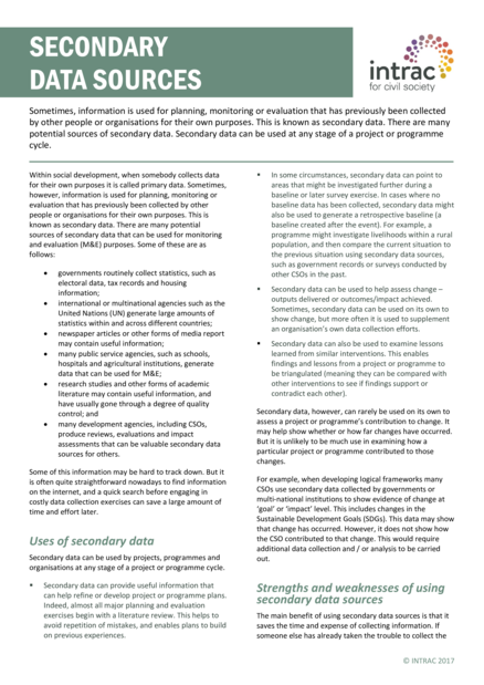 "Sometimes, information is used for planning, monitoring or evaluation that has previously been collected by other people or organisations for their own purposes. This is known as secondary data. There are many potential sources of secondary data. Secondary data can be used at any stage of a project or programme cycle." (Introduction)