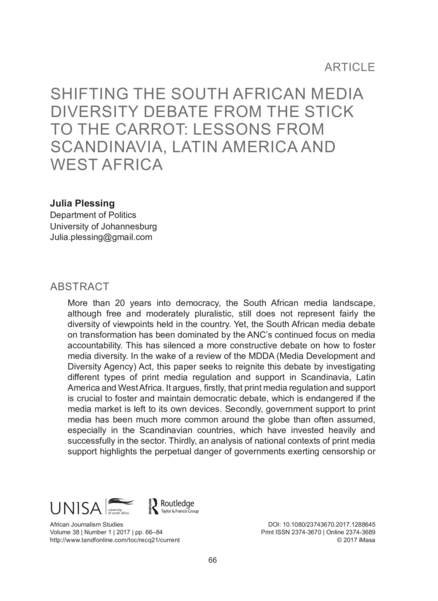 "More than 20 years into democracy, the South African media landscape, although free and moderately pluralistic, still does not represent fairly the diversity of viewpoints held in the country. Yet, the South African media debate on transformation has been dominated by the ANC’s continued focus on media accountability. This has silenced a more constructive debate on how to foster media diversity. In the wake of a review of the MDDA (Media Development and Diversity Agency) Act, this paper seeks to reignite this debate by investigating different types of print media regulation and support in Scandinavia, Latin America and West Africa. It argues, firstly, that print media regulation and support is crucial to foster and maintain democratic debate, which is endangered if the media market is left to its own devices. Secondly, government support to print media has been much more common around the globe than often assumed, especially in the Scandinavian countries, which have invested heavily and successfully in the sector. Thirdly, an analysis of national contexts of print media support highlights the perpetual danger of governments exerting censorship or control. However, as is demonstrated in the paper’s final section, a multiplicity of mechanisms of support exist that could be adapted to the South African context, whilst seeking to minimise state control." (Abstract)