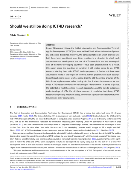 "In over 30 years of history, the field of Information and Communication Technology for Development (ICT4D) has asserted itself both within Information Systems (IS) and across disciplines. However, the core assumptions on which the field was built have been questioned over time, resulting in a situation in which such assumptions—on development, the role of ICTs towards it, and the meaningfulness of the term “developing countries”—have been problematized. As a result, this paper poses the question on whether it still makes sense to do ICT4D research: starting from older ICT4D landscape papers, it fleshes out three main assumptions made at the origins of the field. It then problematizes such assumptions through more recent works, noting that the old theoretical grounds of the field do not apply anymore today. Having said that, it states three reasons for renewed ICT4D research efforts: the reframing of “development” in terms of justice, the potential of multi-theoretical research approaches, and the turn to indigenous understandings of ICTs. For all these reasons, it concludes that doing ICT4D research is especially important today, in virtue of a juncture of history that problematizes its older assumptions." (Abstract)