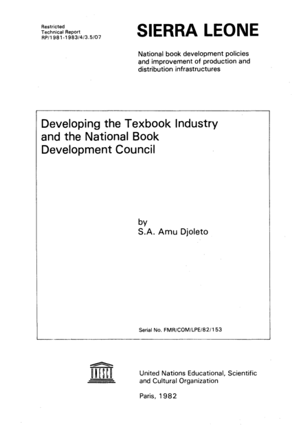 "A UNESCO mission report whose purpose was to assist the Sierra Leone Ministry of Education in the review of existing facilities for the preparation, production, printing and distribution of textbooks in Sierra Leone (particularly those for primary schools); identify any inherent weaknesses and recommend appropriate solutions; and to assist the setting up of a National Book Development Council, and preparing its administrative and management plan in order for it to become operational." (Hans M. Zell, Publishing, Books & Reading in Sub-Saharan Africa, 3d ed. 2008, nr. 919)