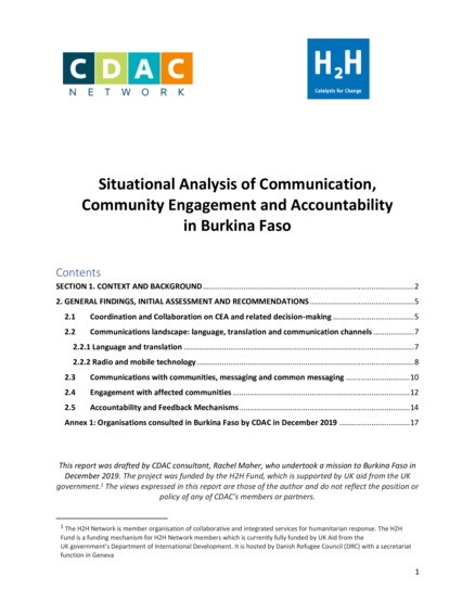 "Burkina Faso is dramatically confronted with the consequences of violence, persistent food insecurity and malnutrition. Five of the thirteen regions of the country are particularly affected, and the humanitarian situation has been steadily deteriorating since 2017 with a peak observed in the second half of 2019. In total, 2.2 million people face crucial unmet needs created by the deterioration of their living conditions; among them more than 918,000 people are in need of services linked to their survival. Efforts are underway to scale up the response to cope with these escalating needs. In late October 2019, the Humanitarian Country Team was activated in Burkina Faso, replacing the Humanitarian-Development Country Team, to enable dedicated leadership in coordination and information management. And between December 2019 and January 2020, the CDAC Network – in partnership with Ground Truth Solutions and with funding from the H2H Network and with the assistance of UN agencies and CDAC members operating in the country – undertook a scoping mission to the country to assess the status, current strengths and needs related to response-wide Communication, Community Engagement and Accountability." (CDAC website)
