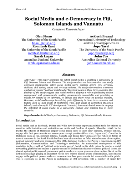 "This paper examines the extent social media is enabling e-democracy in Fiji, Solomon Islands and Vanuatu. The study conducts an interpretative case study approach interviewing active social media users, political actors, civil servants, civilians, civil society actors and tertiary students. The study also conducts a content analysis of popular “political social media” Facebook pages in these three countries. The findings of the study suggest that social media is playing a role in facilitating citizen engagement with governments, making governments accountable and providing a means for citizens to be informed, to discuss and share views on political matters. However, social media usage is evolving quite differently in these three countries and factors such as high levels of militarism (Fiji), high levels of corruption (Solomon Islands) and also rapid ICT development (Vanuatu) have contributed towards shaping the potential of social media as a democratic enabler and political tool in these countries." (Abstract)