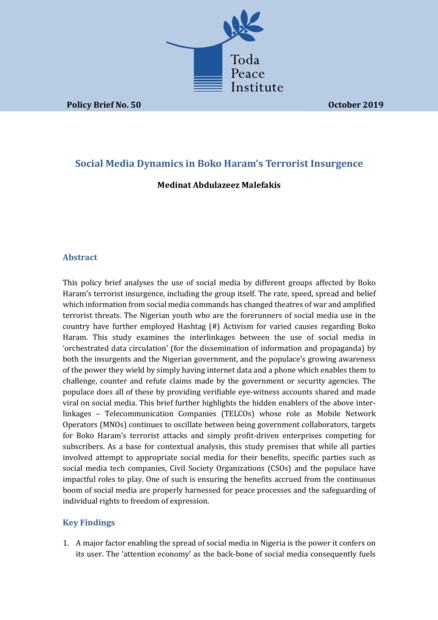 "This policy brief analyses the use of social media by different groups affected by Boko Haram’s terrorist insurgence, including the group itself. The rate, speed, spread and belief which information from social media commands has changed theatres of war and amplified terrorist threats. The Nigerian youth who are the forerunners of social media use in the country have further employed Hashtag (#) Activism for varied causes regarding Boko Haram. This study examines the interlinkages between the use of social media in ‘orchestrated data circulation’ (for the dissemination of information and propaganda) by both the insurgents and the Nigerian government, and the populace’s growing awareness of the power they wield by simply having internet data and a phone which enables them to challenge, counter and refute claims made by the government or security agencies. The populace does all of these by providing verifiable eye-witness accounts shared and made viral on social media. This brief further highlights the hidden enablers of the above interlinkages – Telecommunication Companies (TELCOs) whose role as Mobile Network Operators (MNOs) continues to oscillate between being government collaborators, targets for Boko Haram’s terrorist attacks and simply profit-driven enterprises competing for subscribers. As a base for contextual analysis, this study premises that while all parties involved attempt to appropriate social media for their benefits, specific parties such as social media tech companies, Civil Society Organizations (CSOs) and the populace have impactful roles to play. One of such is ensuring the benefits accrued from the continuous boom of social media are properly harnessed for peace processes and the safeguarding of individual rights to freedom of expression." (Abstract)